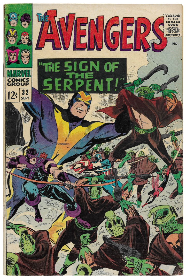 Avengers Vol. 1 #32, published in September 1966, is a major Silver Age key issue featuring the first appearance of the Sons of the Serpentโa masked hate group that brings themes of bigotry and fear to the forefront of Marvel storytelling. As this extremist organization threatens to divide the nation, Captain America, Hawkeye, Goliath, Quicksilver, and Scarlet Witch must face a different kind of evil: one rooted in ideology rather than brute force.