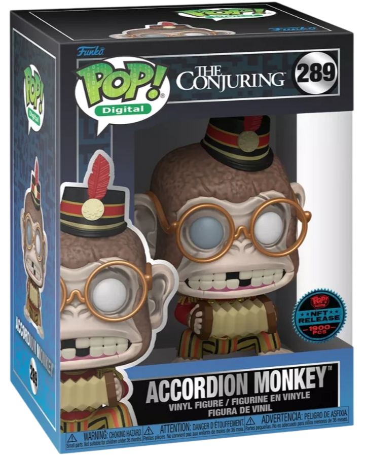 Introducing the Funko Pop! Digital: The Conjuring – Accordion Monkey #289 (NFT Legendary Edition)—a rare and eerie collectible from the WB Horror x Funko Series 2. Released on April 30, 2024, this figure had a total supply of 1,900 pieces, with 1,808 redeemed, making it a highly sought-after item for collectors.
